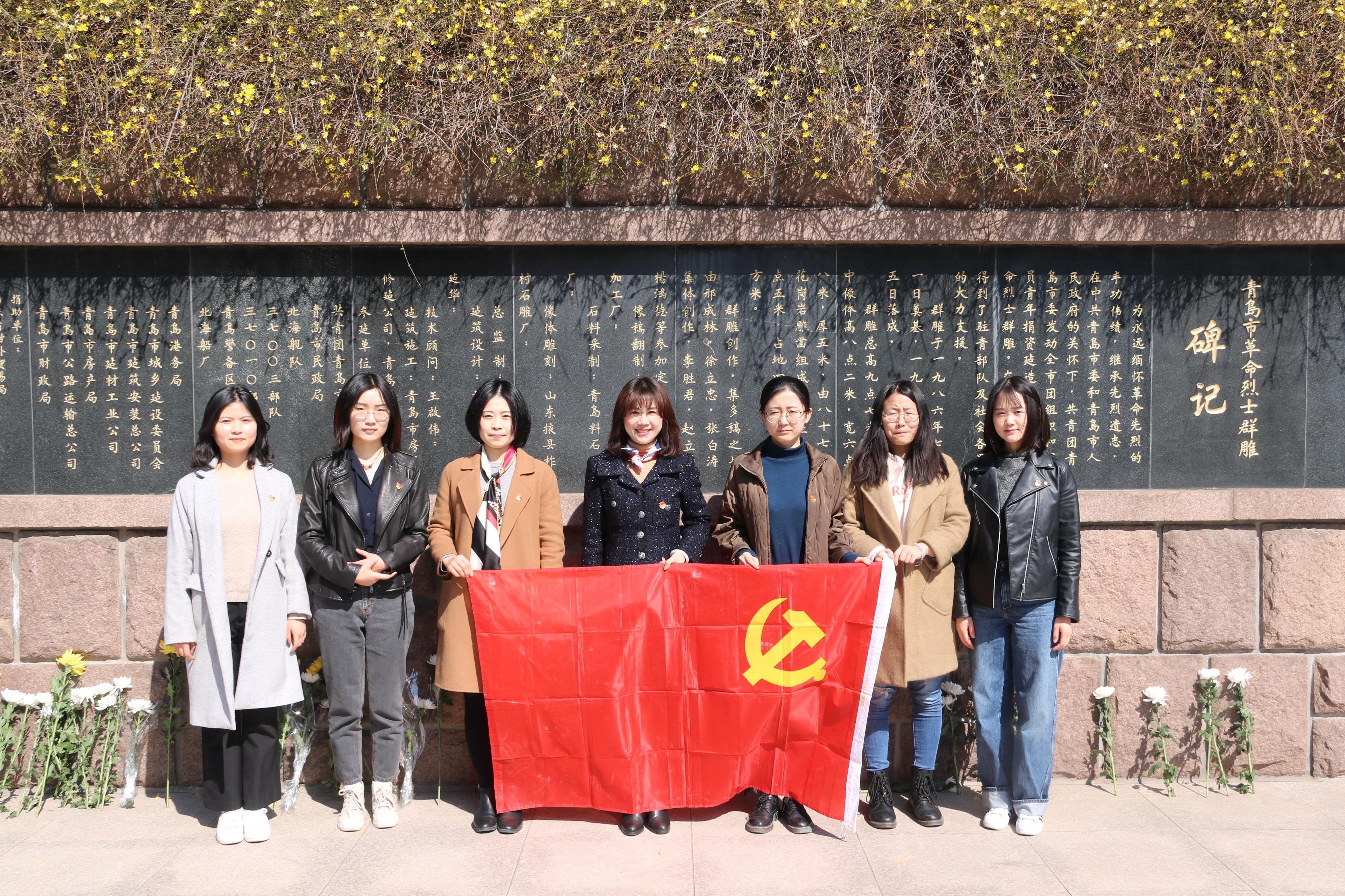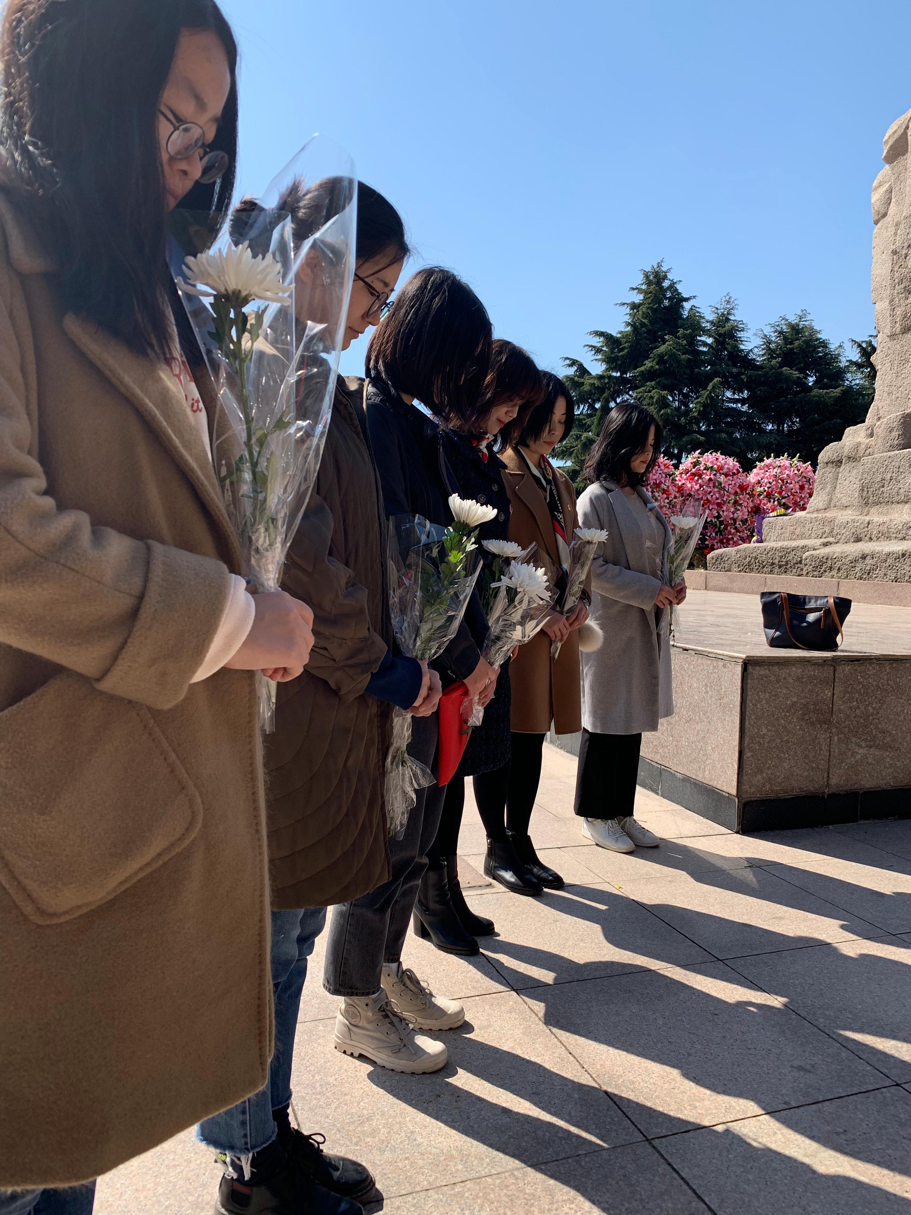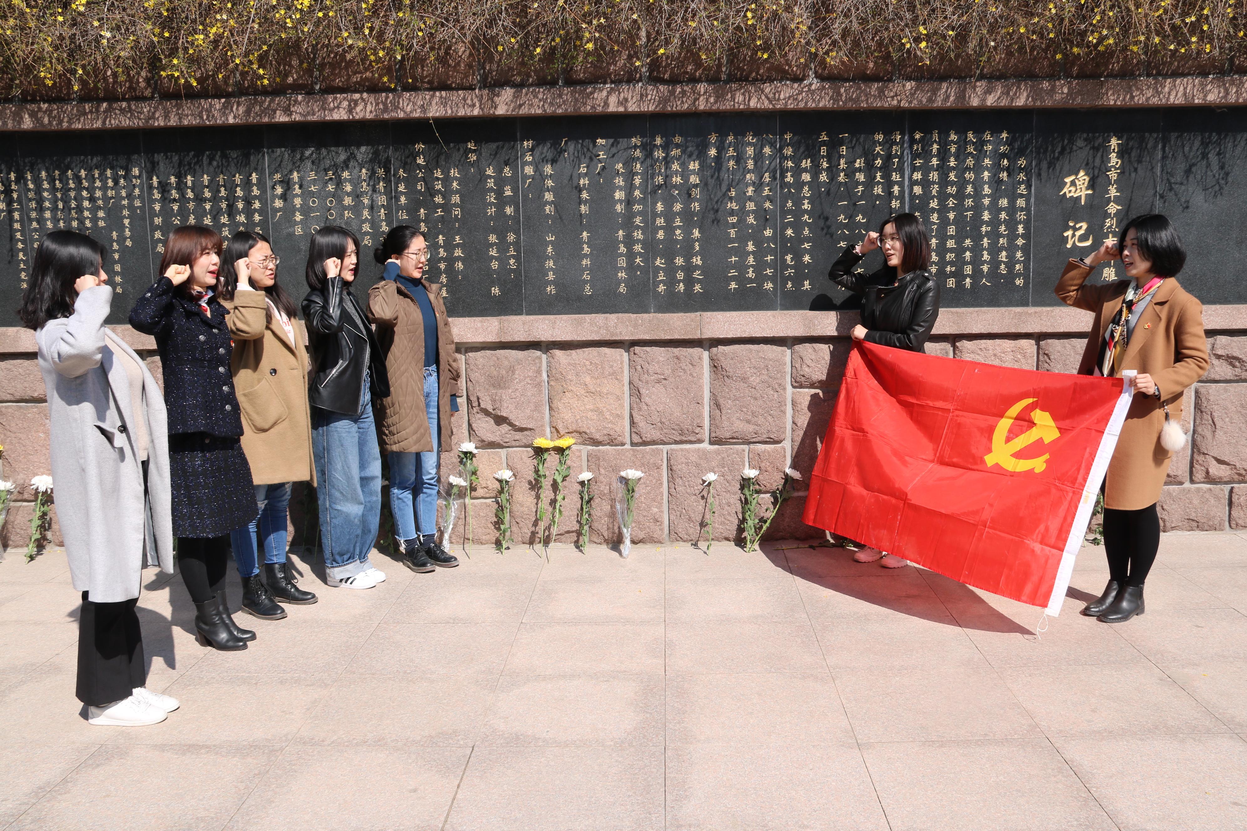在“山河魂”革命烈士群雕面前,各位党员以严肃恭敬的心态,向烈士们致以深深的敬意。随后,党支部全体成员在青岛市革命烈士群雕碑记前脱帽肃立并向烈士们默哀。礼毕后,大家依次排队献花,寄托对烈士的哀思。接着,党支部书记于苗老师就此次活动发表讲话。她表示,烈士们浴血奋斗换来今天幸福生活,每位党员都要牢记历史,肩负使命,为共产主义事业奋斗。最后,在周昱宏老师的带领下,全体党员同志重温了入党誓词,以表达对共产党的忠诚和对烈士的敬仰。